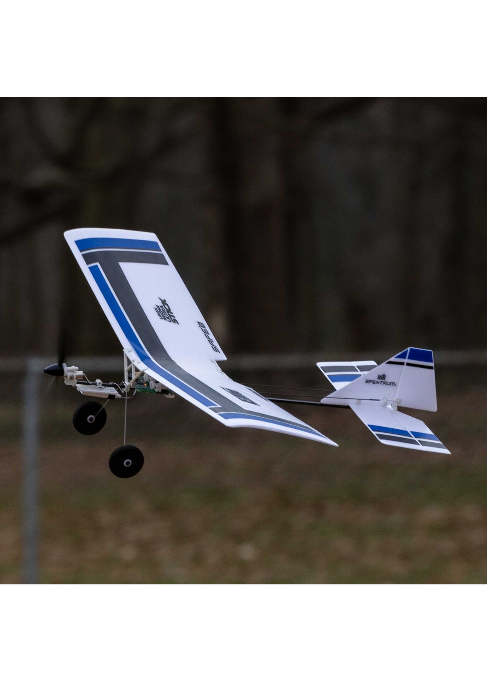 The Ready-To-Fly (RTF) version includes everything needed to fly in one box and is a perfect choice if you're looking for maximum convenience and value. From the Spektrum SLT6 2.4GHz transmitter you can use with other Bind-N-Fly® (BNF) Basic aircraft compatible with SLT FHSS technology to the 1S 150mAh LiPo battery and a convenient USB charger that can be used with a variety of power sources, there's nothing extra you need to buy or provide! A BNF Basic version is also available for pilots who want to use their favorite Spektrum DSMX-equipped transmitter along with batteries and chargers they may already own. Both versions include exclusive AS3X® and optional-use SAFE® Select technologies, plus a reliable power system featuring a “pop off” prop saver design, a control unit including an ESC, servos, and a dual-protocol (DSMX and SLT FHSS) receiver that are factory-installed in the lightweight yet durable airframe that’s nearly ready to fly right out of the box. Simply install the wing by quickly and easily snapping it into place and you can be flying in almost no time!