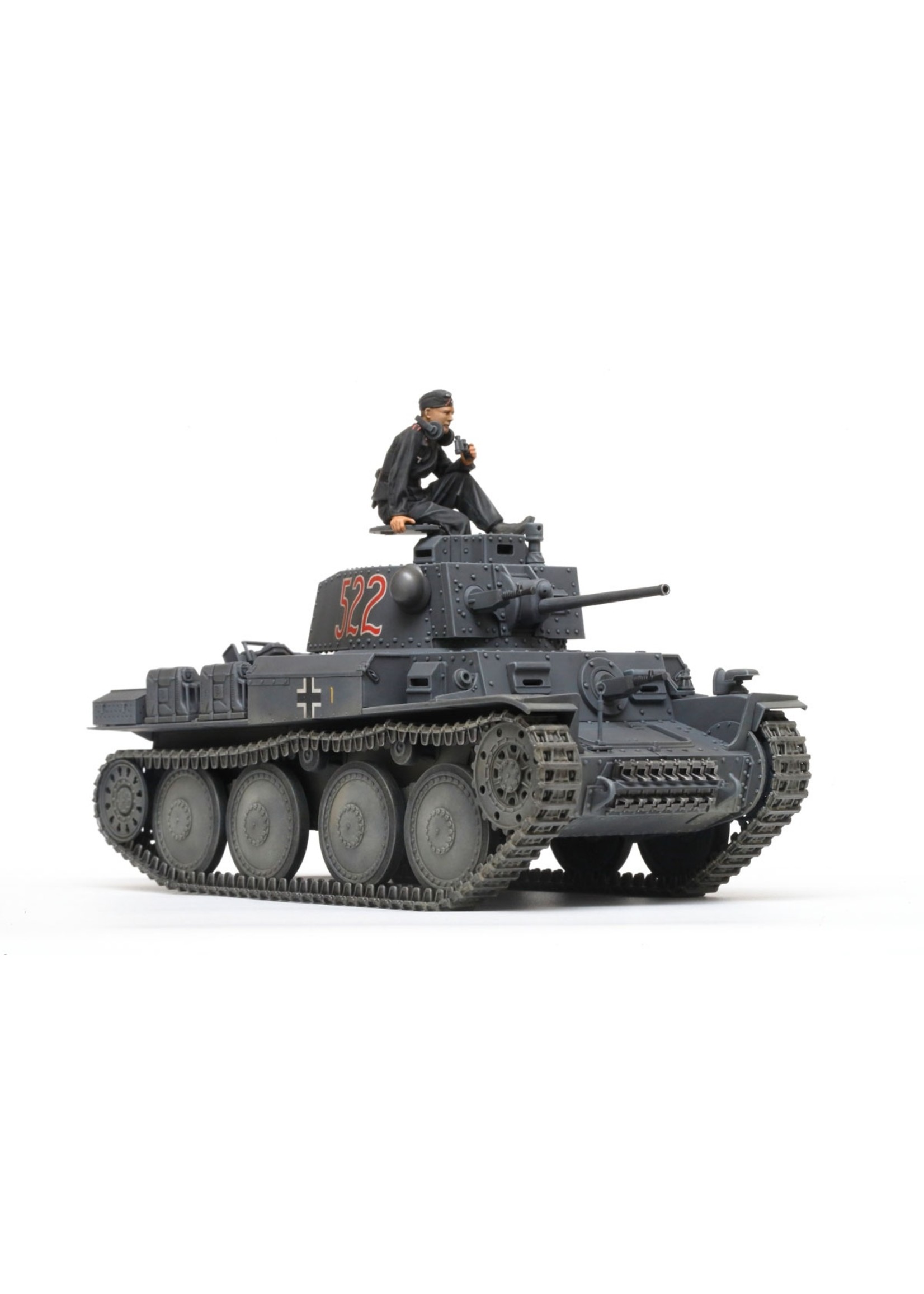 This Tamiya 1/35 scale military miniature recreates one of Germany's formidable lightweight tanks. This subject in fact started life as a light tank developed for Czechoslovakia, but was adopted and renamed 38(t) by German forces after their occupation of the country in 1939. It was equipped with a 3.7cm main gun and could reach speeds of up to 42km/h powered by the 125hp engine. A number of variants were produced, of which the Ausf. E/F 38(t)s were manufactured over a one-year period from November 1940; they featured improved armor and were thrown into the conflict with Soviet forces after the start of Operation Barbarossa.